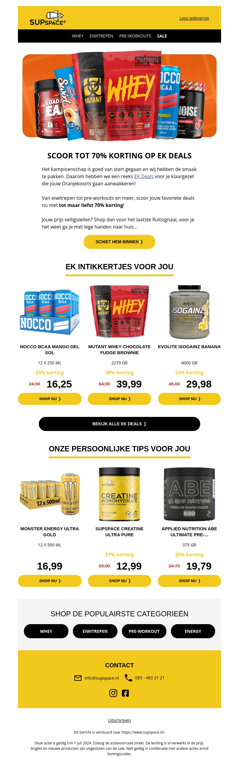 Het kampioenschap is begonnen bij SUPSPACE en wij vieren dit met spectaculaire kortingen op jouw favoriete supplementen. Profiteer van tot wel 70% korting op eiwitrepen, pre-workouts en meer. Mis deze EK Deals niet!