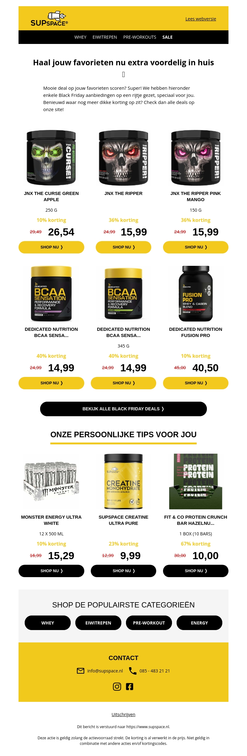 Profiteer van de beste Black Friday deals op al jouw favoriete producten bij Supspace. Of je nu op zoek bent naar whey, eiwitrepen of pre-workouts, alles is nu extra voordelig geprijsd. Mis deze kans niet om geweldige kortingen te pakken op merken zoals JNX en Dedicated Nutrition. Bezoek onze site en vind nog meer spectaculaire aanbiedingen. Shop nu en haal je voordeel uit deze tijdelijke acties!