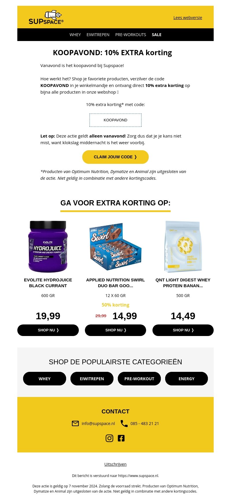Vanavond is het koopavond bij Supspace met een exclusieve korting van 10% op bijna alle producten. Gebruik de code KOOPAVOND om direct te profiteren van deze aanbieding. Let op: de actie geldt alleen vanavond, dus mis het niet! Verken onze aanbevolen producten en shop in de favoriete categorieรซn zoals whey, eiwitrepen en pre-workout.