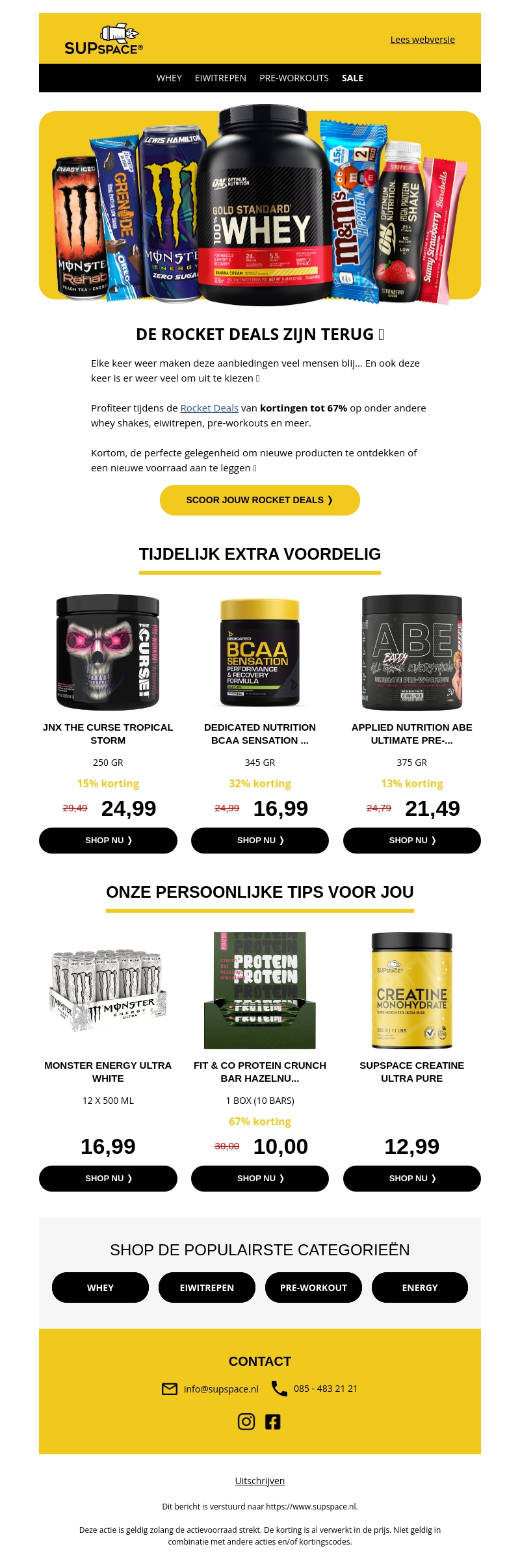 Supspace presenteert de ultieme Rocket Deals met kortingen tot 67% op een breed scala aan producten. Of je nu whey shakes, eiwitrepen of pre-workouts zoekt, er is voor ieder wat wils. Nu is het perfecte moment om te profiteren van deze spectaculaire aanbiedingen. Bekijk ook onze persoonlijke tips voor must-have producten. Mis het niet, en scoor jouw deals vandaag!