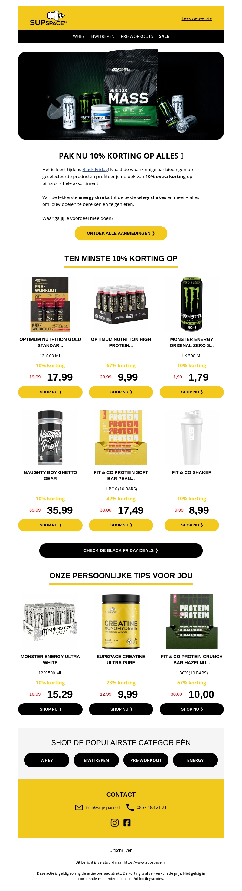 Het is feest tijdens Black Friday! Geniet van waanzinnige aanbiedingen en scoor nu 10% extra korting op bijna het hele assortiment. Van de lekkerste energy drinks tot de beste whey shakes, er is voor ieder wat wils. Ontdek de persoonlijke tips en shop de populairste categorieรซn. Waar wacht je nog op?
