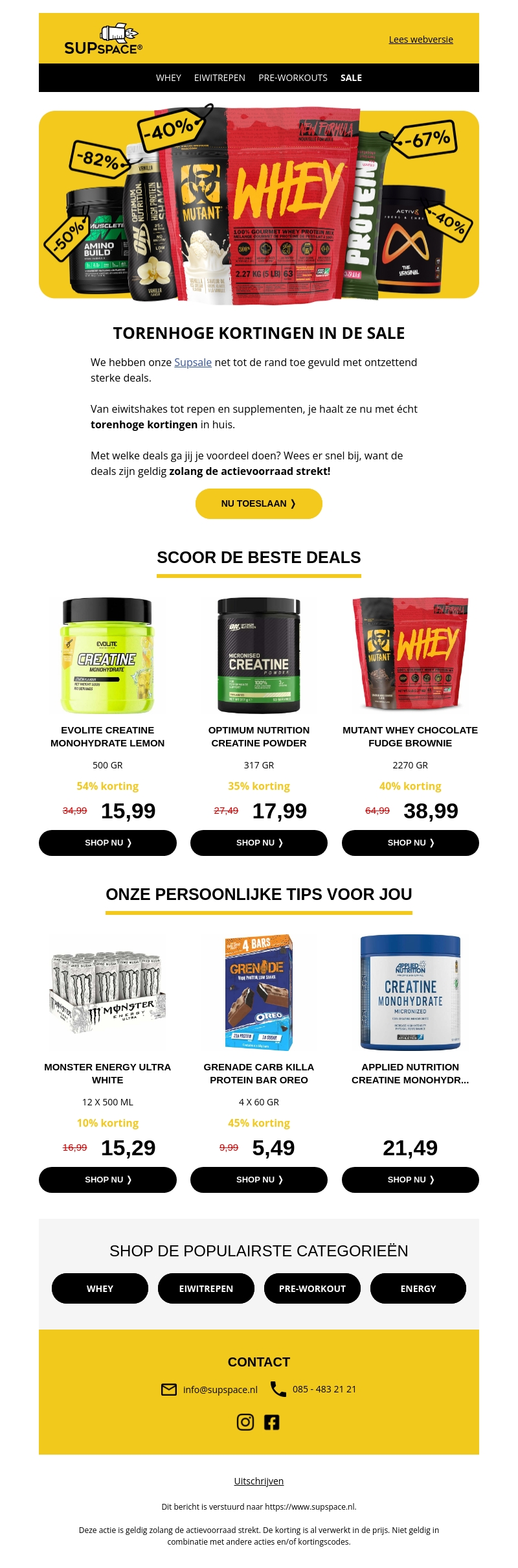 Supspace presenteert Supsale met gigantische kortingen op diverse producten zoals eiwitshakes, repen, en supplementen. Scoor nu je favoriete creatine of energydrinks met kortingen tot wel 82%. De aanbiedingen zijn geldig zolang de voorraad strekt, dus wees er snel bij!
