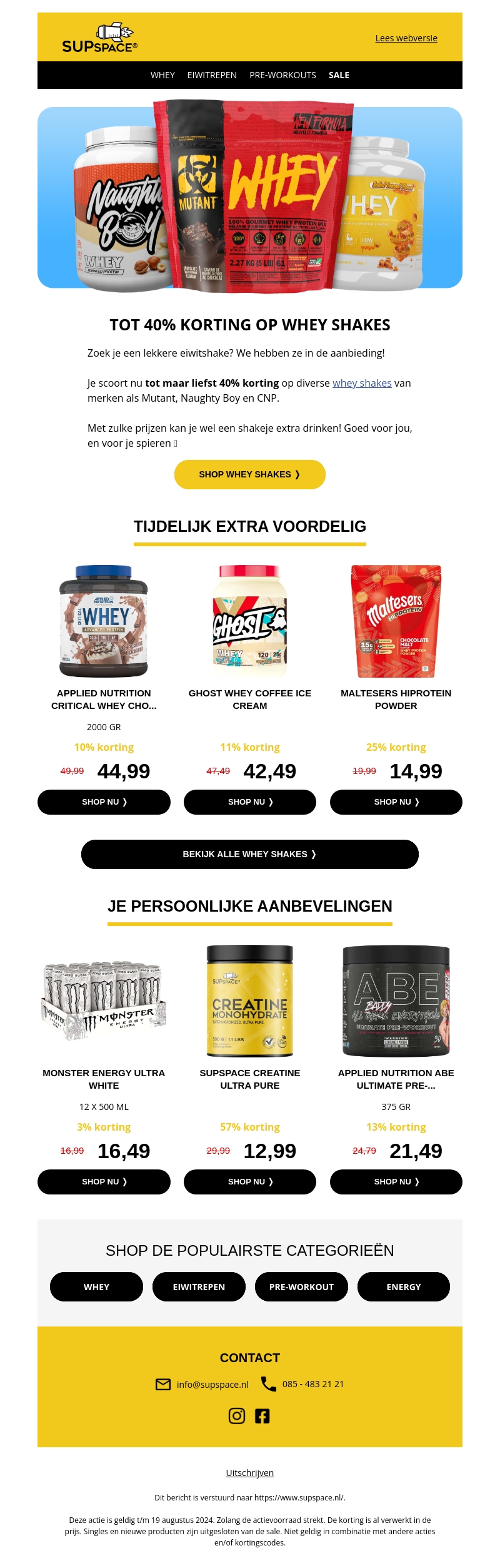 Zoek je een heerlijke eiwitshake? Supspace biedt nu tot 40% korting op whey shakes van merken als Mutant, Naughty Boy en CNP. Profiteer tijdelijk van geweldige aanbiedingen en boost je spierherstel met deze topkwaliteit shakes.
