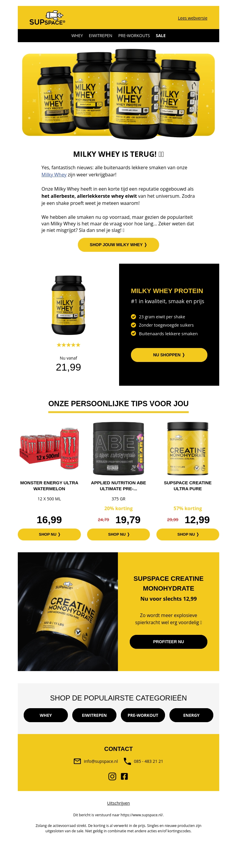 Geweldig nieuws: Milky Whey is terug met al zijn buitenaards lekkere smaken. Dit eiwit is al snel een favoriet geworden vanwege zijn lekkere smaak en hoge kwaliteit. We hebben alle smaken nu op voorraad, maar wees snel voordat ze weer weg zijn!