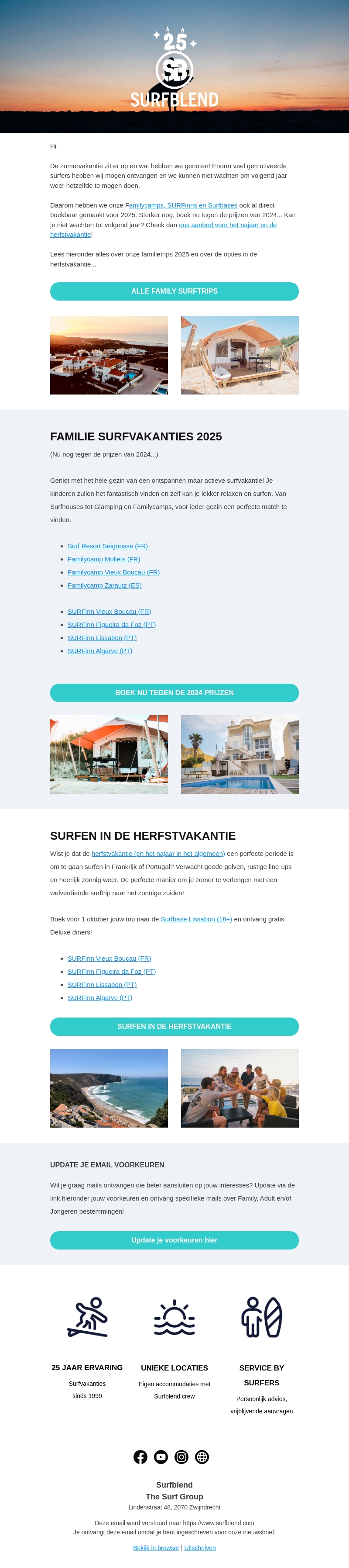 Familievakanties 2025 nu beschikbaar tegen de prijzen van 2024! Bezoek onze campings en resorts om te genieten van surfplezier met je gezin. Ontvang korting voor bepaalde bestemmingen. Lees meer over deze geweldige aanbiedingen en boek je vakantie vandaag nog!