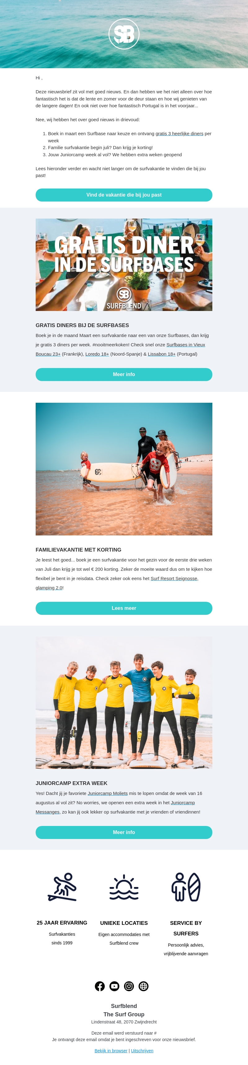 Deze nieuwsbrief staat vol met spannende aanbiedingen voor surfvakanties. Boek in maart om te genieten van gratis diners per week op onze surfbases. Daarnaast ontvang je korting op familievakanties als je in juli boekt. We hebben ook een extra week geopend voor de Juniorcamp. Mis de kans niet om de perfecte surfvakantie te vinden!
