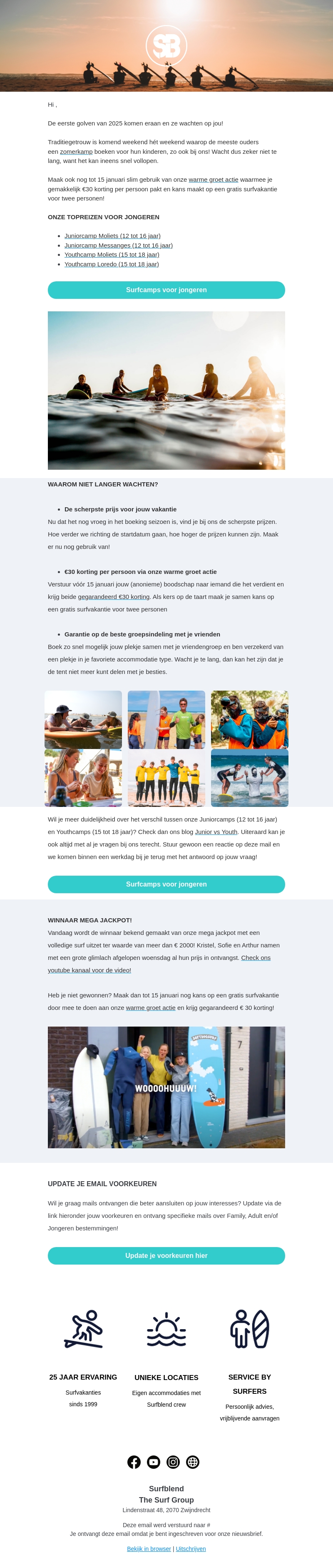 Surfblend 2025 staat voor de deur met opwindende surfkampen voor jongeren! Boek nu een zomerkamp voor je kinderen en profiteer van de scherpe prijzen. Haast je, want plaatsen zijn snel gevuld. Gebruik de warme groot actie voor €30 korting en maak kans op een gratis surfvakantie voor twee. Mis deze kans niet!
