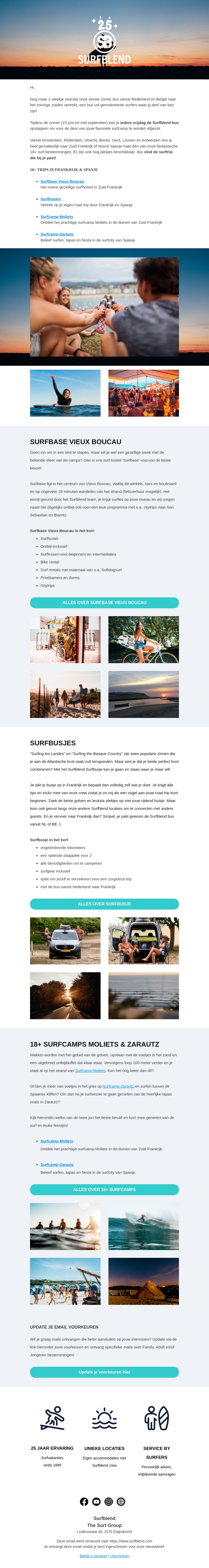 Mis niet de kans om deze zomer een geweldige surfervaring te beleven met Surfblend. Ontdek surfbases zoals Vieux Boucau en Surfbuse. Ook bieden we 18+ surfcamps aan in Moliets en Zarautz. Profiteer van wekelijkse surflessen, gezellige overnachtingen en activiteiten.
