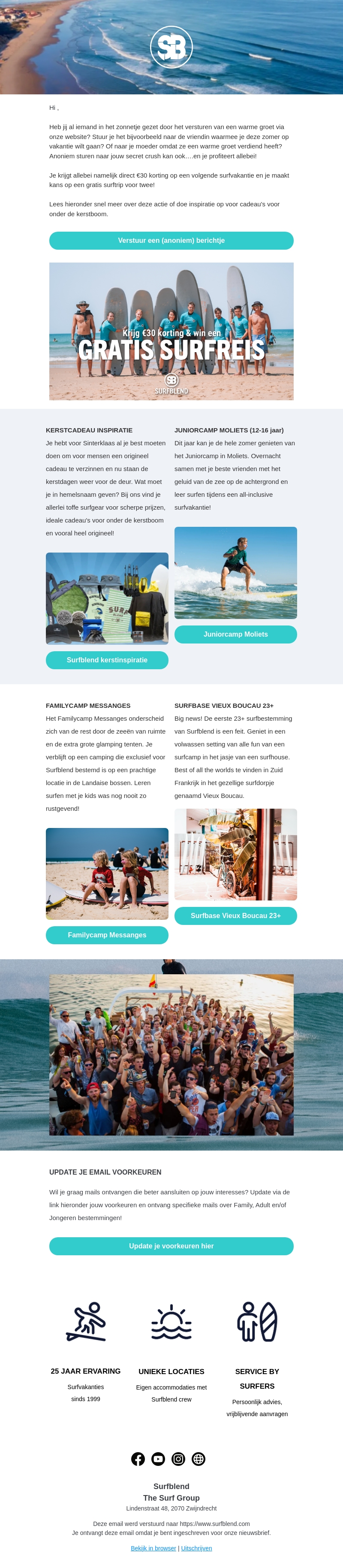 Heb je een vriend die je met een zonnige boodschap wilt verrassen? Stuur een anonieme groet via onze website en maak kans op een surfvakantie. Profiteer van €30 korting op je volgende surfavontuur. Ontdek ook onze geweldige surfkampen voor familie en jongeren. Geniet van unieke surfervaringen onder begeleiding van de Surfblend crew.