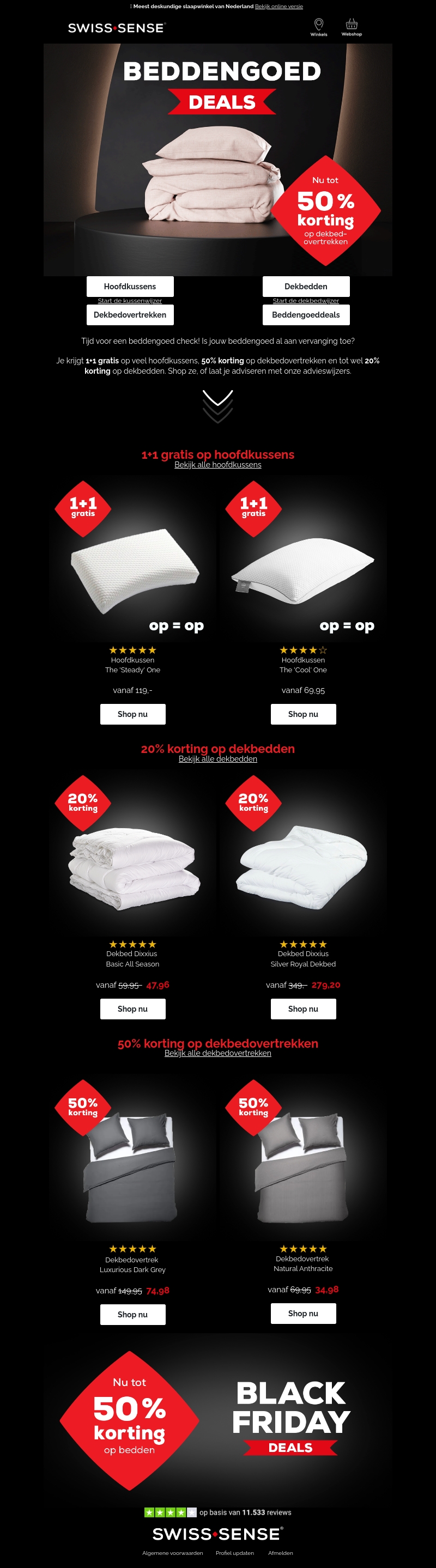 Mis deze kans niet om te besparen op jouw beddengoed tijdens de Black Friday Deals van Swiss Sense. Geniet van 1+1 gratis op kussens en tot 50% korting op dekbedovertrekken. De aanbiedingen zijn beperkt, dus sla snel je slag!