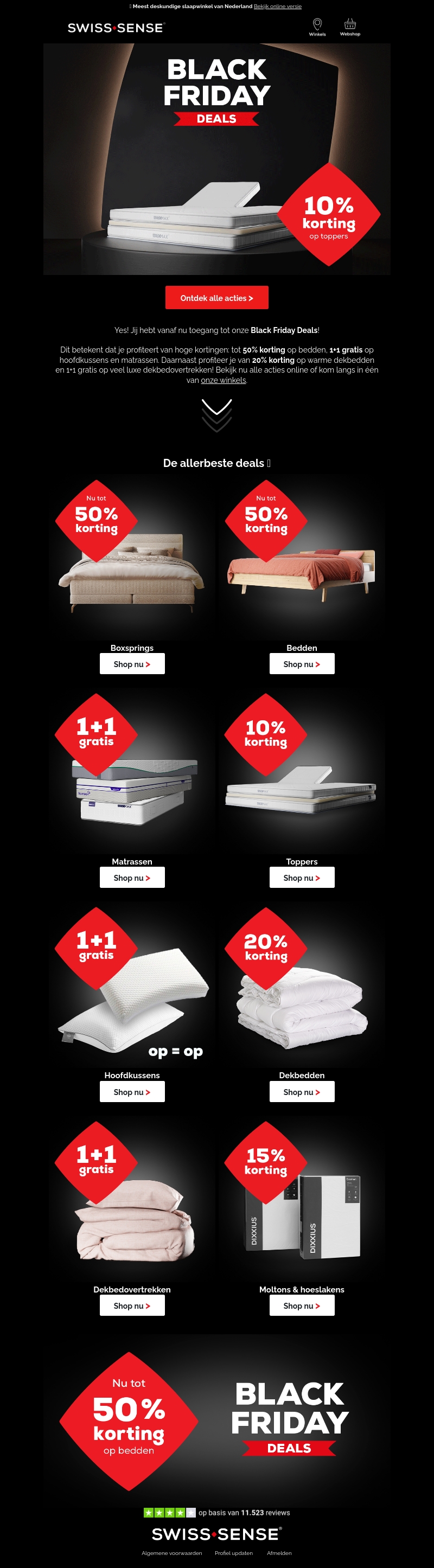 Ontdek de spannende Black Friday Deals van Swiss Sense met kortingen tot 50% op bedden. Profiteer ook van 1+1 gratis aanbiedingen op matrassen en hoofdkussens. Grijp je kans op 10% korting op toppers en geniet van 20% korting op dekbedden. Deze aanbiedingen zijn slechts tijdelijk beschikbaar. Bezoek nu onze winkels of webshop.