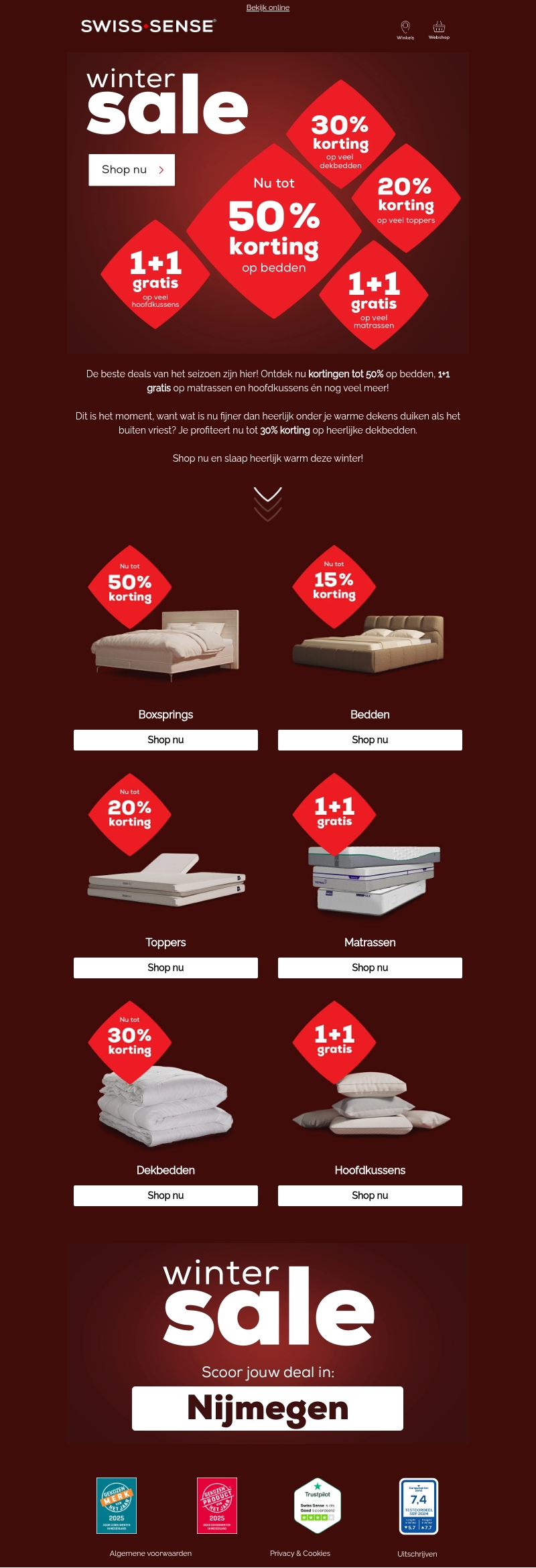 De Swiss Sense Winter Sale is begonnen met ongelooflijke aanbiedingen. Geniet van tot 50% korting op bedden en matrassen, en speciale 1+1 gratis acties op hoofd- en dekbedden. Grijp deze kans om jouw slaapcomfort te verbeteren. Shop nu en profiteer van de beste deals dit seizoen. Mis deze geweldige kans niet, slaap warm en comfortabel deze winter!