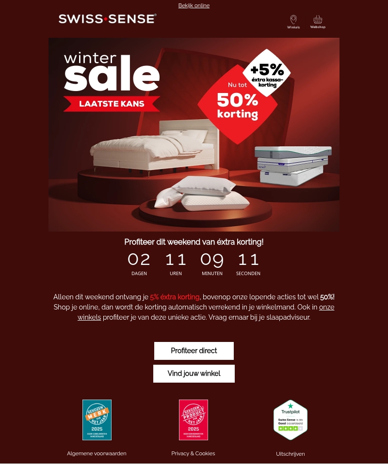 Dit weekend biedt Swiss Sense een uitzonderlijke kans om extra te besparen. Met 5% kassakorting bovenop lopende acties kun je genieten van de beste deals. Bezoek een van onze winkels of shop online en profiteer van deze unieke aanbiedingen. Vraag in de winkel naar meer informatie.