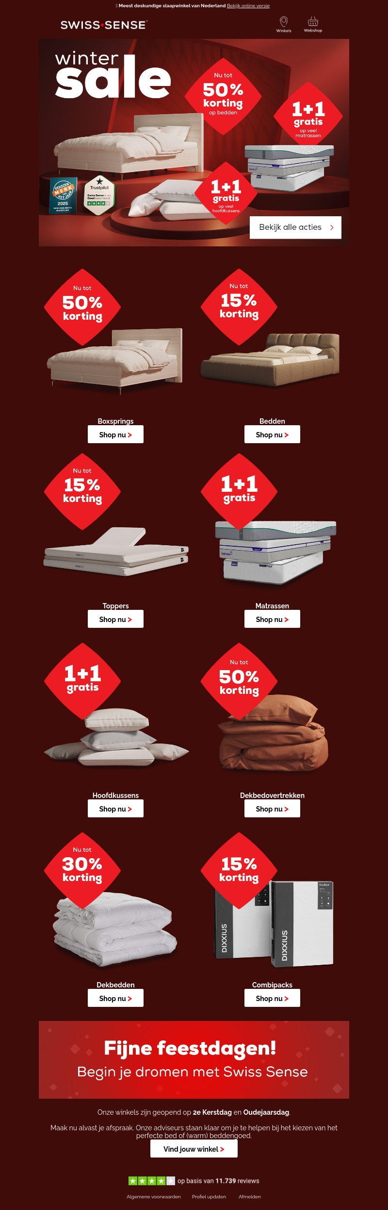 Winteruitverkoop bij Swiss Sense! Profiteer van kortingen tot 50% op bedden, matrassen en toppers. Ervaar ultiem comfort deze feestdagen met onze exclusieve aanbiedingen. Bezoek onze winkels met feestdagen voor persoonlijk advies. Begin je 2023 uitgerust en stijlvol met Swiss Sense.