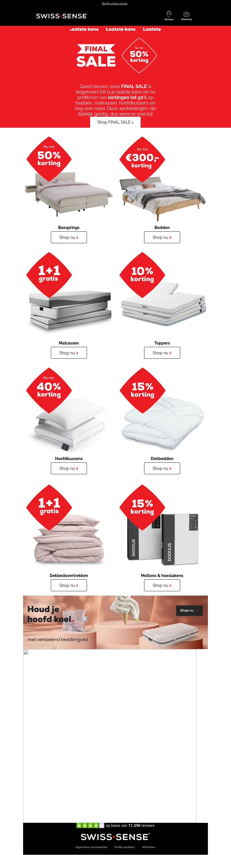 Goed nieuws: de Swiss Sense FINAL SALE is begonnen! Dit is je laatste kans om te profiteren van kortingen tot 50% op bedden, matrassen, hoofdkussens en meer. Deze aanbiedingen zijn tijdelijk, dus wees er snel bij. Shop nu en bespaar tot β¬300,-!