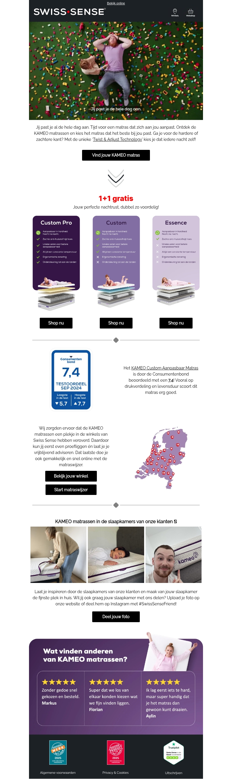 Het is tijd voor een matras dat zich aan jou aanpast. Het KAMEO matras van Swiss Sense biedt ultiem comfort met de unieke Twist & Adjust Technology. Kies voor een hardere of zachtere kant met gemak. Momenteel profiteer je van een speciale 1+1 gratis aanbieding. Het matras is hoog beoordeeld door consumenten en biedt een perfecte nachtrust. Ontdek het zelf bij een Swiss Sense winkel bij jou in de buurt.