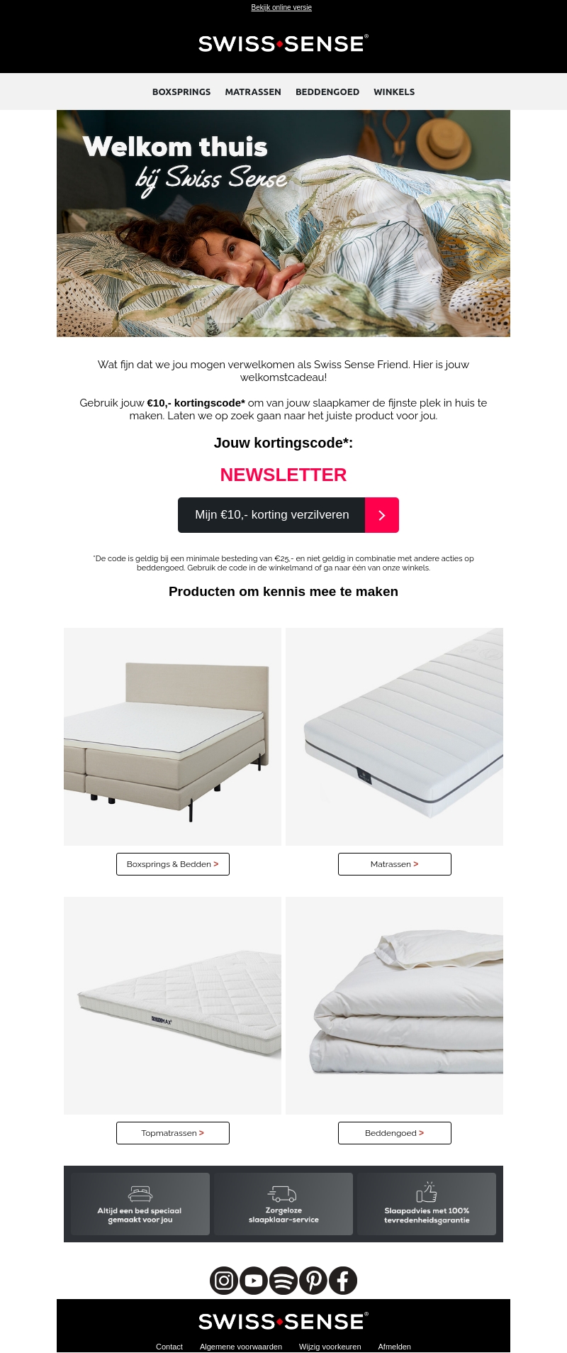 Wij heten je welkom als Swiss Sense Friend met een speciaal cadeau: €10,- korting op je volgende aankoop. Ontdek ons uitgebreide assortiment en maak je slaapkamer nog comfortabeler en stijlvoller. Gebruik de kortingscode NEWSLETTER voor je korting.