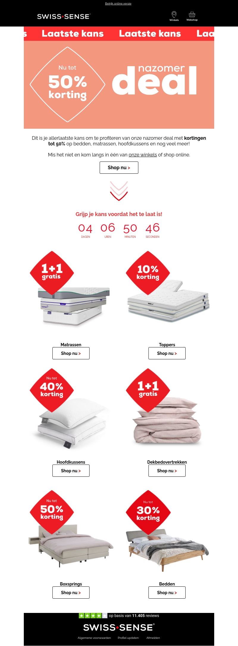 Profiteer nu van onze nazomer deal met kortingen tot 50% op een ruime selectie van bedden, matrassen, hoofdkussens en meer. Grijp je kans en shop nu om te genieten van deze aanbiedingen! Mis het niet, actie is beperkt.