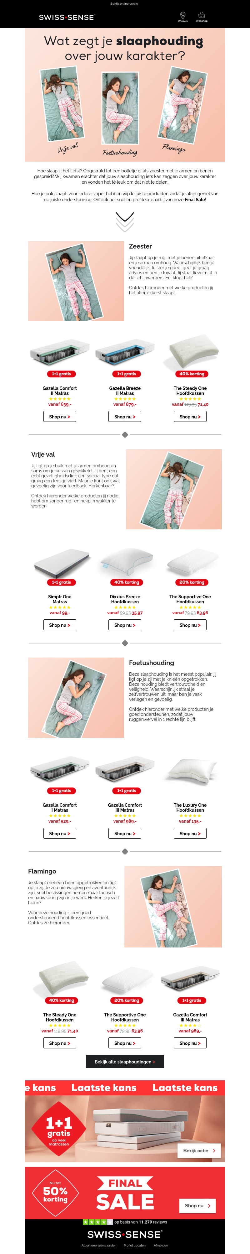 Benieuwd wat jouw slaaphouding zegt over jouw karakter? Lees verder om meer te leren over de betekenissen van verschillende slaapposities en ontdek onze speciale aanbiedingen. Ontdek hoe je met een nieuwe matras of kussen je slaap kunt verbeteren. Profiteer ook van onze Final Sale voor geweldige kortingen!