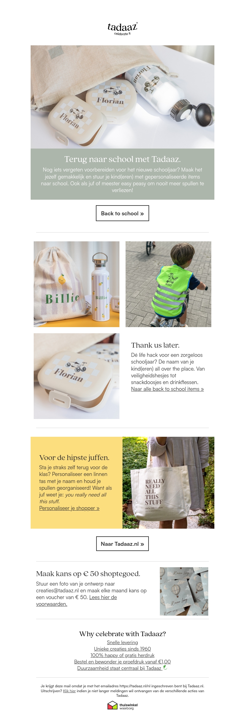Terug naar school met Tadaaz! Ontdek gepersonaliseerde items zoals drinkflessen, snackdoosjes en veiligheidsvestjes om het nieuwe schooljaar georganiseerd en veilig te starten. Maak kans op âŦ50 shoptegoed door jouw ontwerp naar ons te sturen. Lees verder voor meer informatie.