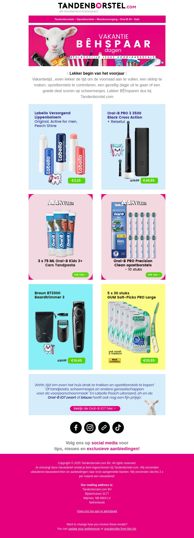 Geniet van heerlijke voorjaarsdeals tijdens de Vakantie BÊhspaar dagen bij Tandenborstel.com. Vul je voorraad aan met aantrekkelijke kortingen op opzetborstels, mondverzorging en meer. Perfect voor een fris begin van het seizoen. Mis de exclusieve deals niet!