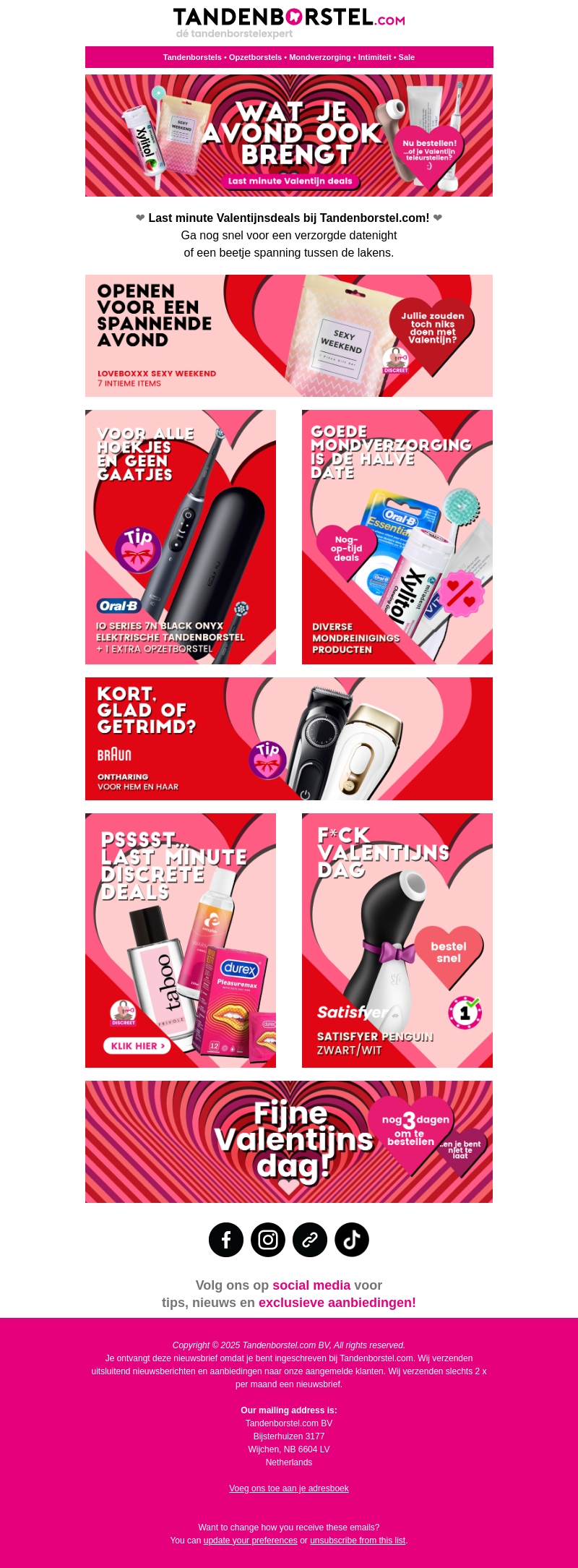 Vier Valentijnsdag op de beste manier met onze exclusieve deals. Of je nu een romantische avond plant of een beetje spanning zoekt, Tandenborstel heeft de perfecte producten voor jou. Profiteer van kortingen op mondverzorging en intieme artikelen en zorg voor een onvergetelijke dag.