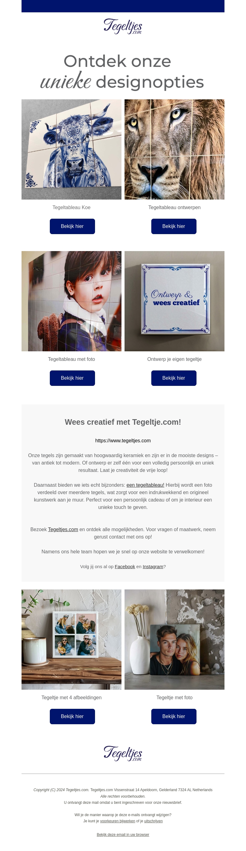 Ontdek de unieke designopties van Tegeltjes.com en laat je creativiteit de vrije loop met prachtige tegeltableaus. Kies uit verschillende stijlen en materialen of ontwerp je eigen creatie. Perfect voor een persoonlijk cadeau of voor een uniek interieur. Bezoek onze website om alle mogelijkheden te verkennen!