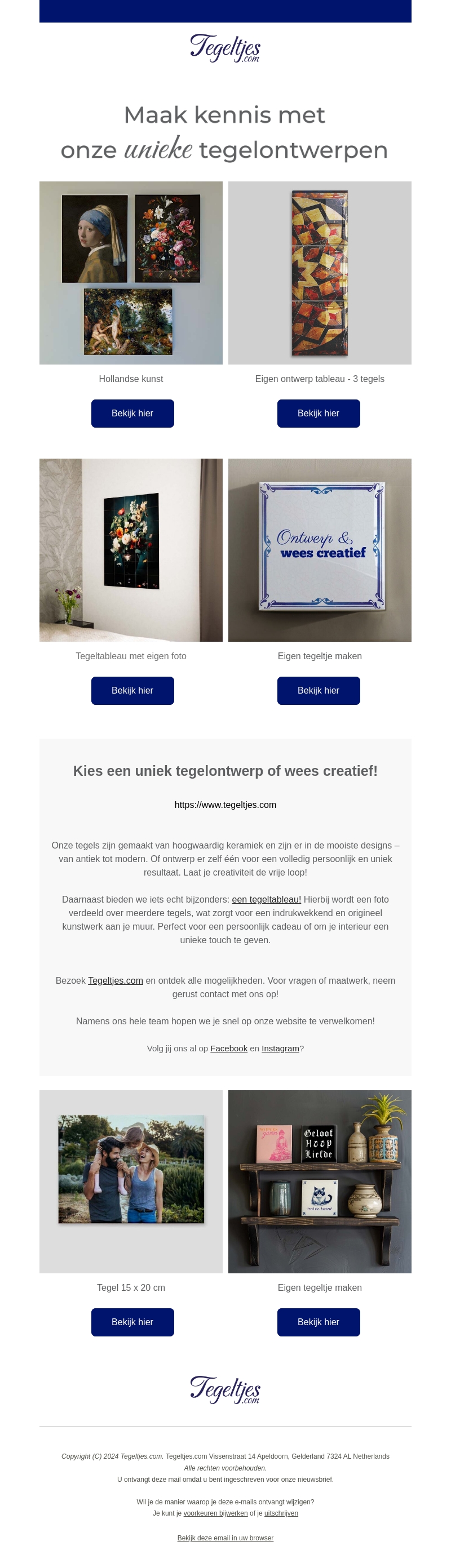 Maak kennis met de unieke tegelontwerpen van Tegeltjes.com. Ontwerp je eigen tegels met hoogwaardig keramiek in diverse designs van antiek tot modern. Of kies een tegeltableau voor een indrukwekkend kunstwerk aan de muur. Bezoek Tegeltjes.com en start met ontwerpen!