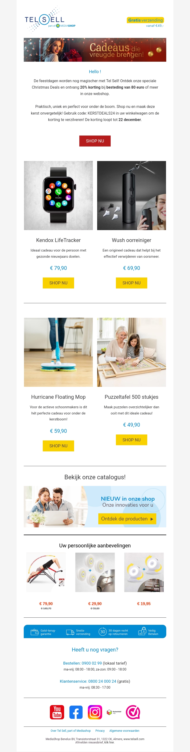 De feestdagen zijn nog magischer met de speciale Christmas Deals van Tel Sell. Ontvang 20% korting bij besteding vanaf β¬80. Vind praktische en unieke cadeaus zoals de Kendox LifeTracker en de Wush oorreiniger. Gebruik de kortingscode KERSTDEALS24 om de korting te verzilveren voor 22 december. Mis deze kans niet om onvergetelijke kerstcadeaus te shoppen!