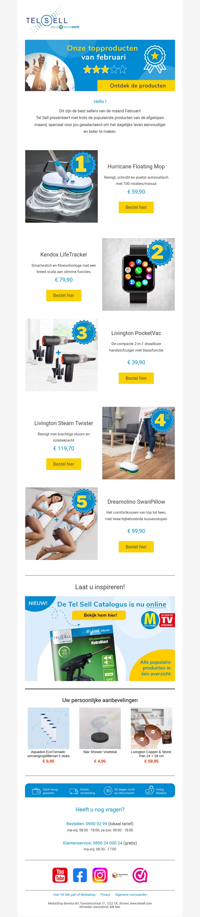 Deze nieuwsbrief van Tel Sell presenteert de bestverkochte producten van de maand februari. Van de Hurricane Floating Mop tot de Dreamolino SwanPillow, deze items maken uw dagelijks leven gemakkelijker. Ontdek nu de details van deze topartikelen. Speciale aanbiedingen en exclusieve producten wachten op u!