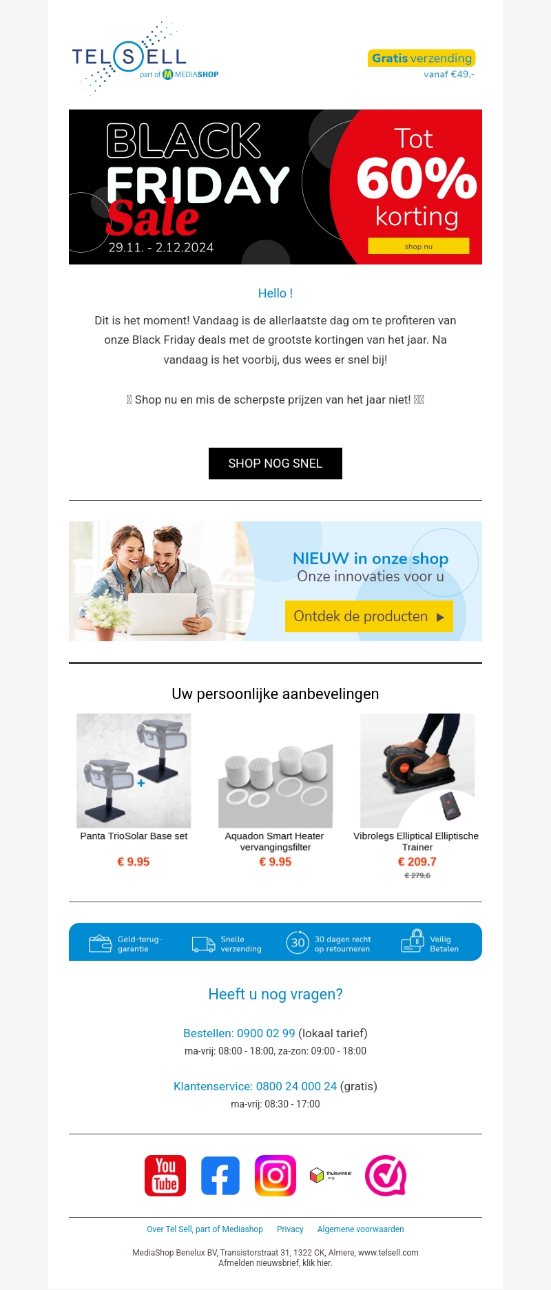 Vandaag is de laatste dag om te profiteren van de grootste kortingen van het jaar tijdens onze Black Friday deals! Sla snel je slag en ontdek scherpe prijzen. Nieuw in de shop: innovatieve producten speciaal voor jou. Persoonlijke aanbevelingen met geweldige deals. Gratis verzending vanaf β¬49.