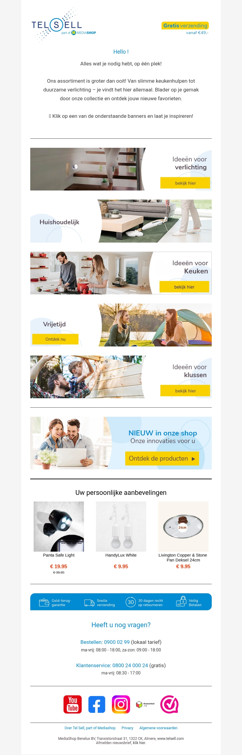 Tel Sell biedt een uitgebreid assortiment aan producten, variΓ«rend van slimme keukenhulpjes tot duurzame verlichtingsopties. Ontdek de nieuwste innovaties en profiteer van persoonlijke aanbevelingen. Geniet van gratis verzending bij bestellingen vanaf β¬49 en ervaar de voordelen van snelle verzending en veilig betalen. Klik op de banners voor inspiratie en exclusieve deals.