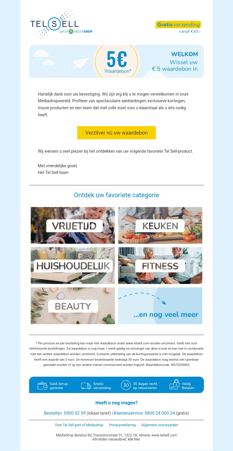 Welkom bij Tel Sell, onderdeel van Mediashop. Ontvang een exclusieve €5 waardebon als welkomsgeschenk en geniet van spectaculaire producten en aanbiedingen. Ontdek uw favoriete categorieën zoals Vrijetijd, Keuken, Huishoudelijk, Fitness en Beauty. Verken ons veelzijdige aanbod en profiteer van snelle verzending en een 30 dagen retourrecht.