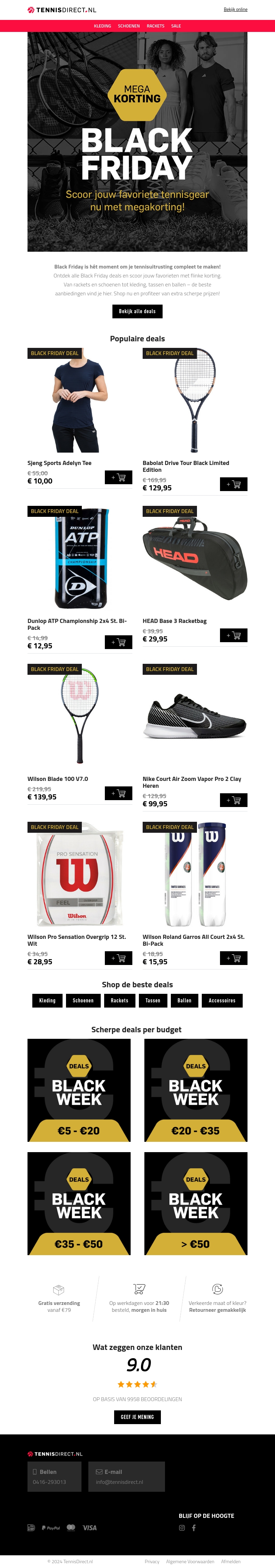 Black Friday is dé kans om jouw tennisuitrusting compleet te maken met geweldige kortingen bij TennisDirect.nl. Profiteer van aanbiedingen op tenniskleding, rackets en accessoires. Van Wilson tot Babolat, er is voor ieder wat wils. Mis het niet en scoor de beste gear tegen scherpe prijzen. Ontdek ook de budgetvriendelijke opties en bekijk wat onze klanten over ons zeggen!