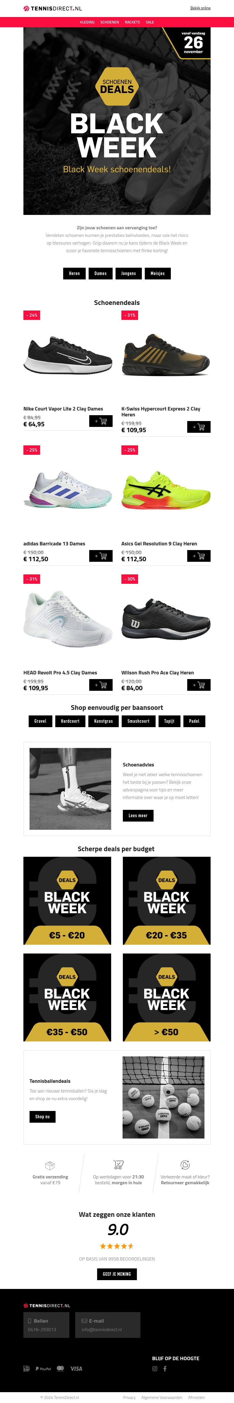 Het is Black Week bij Tennisdirect.nl, wat betekent dat er geweldige kortingen zijn op een breed scala aan tennisschoenen. Of je nu op zoek bent naar schoenen voor hardcourt, gravel of indoorbanen, er zijn deals voor elke ondergrond en budget. Profiteer van scherpe kortingen en hou je voet stevig in het spel met merken zoals Nike, Adidas en Asics. Bestel voor 21:00 uur en ontvang je bestelling morgen al in huis! Gratis verzending vanaf €50 en eenvoudig retourneren mogelijk.