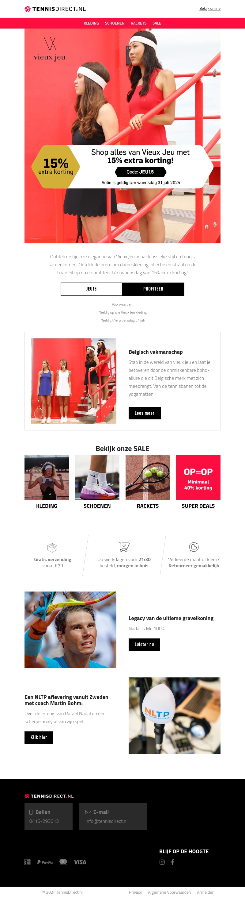 ACTIE: 15% extra korting op alle tenniskleding van Vieux Jeu!
