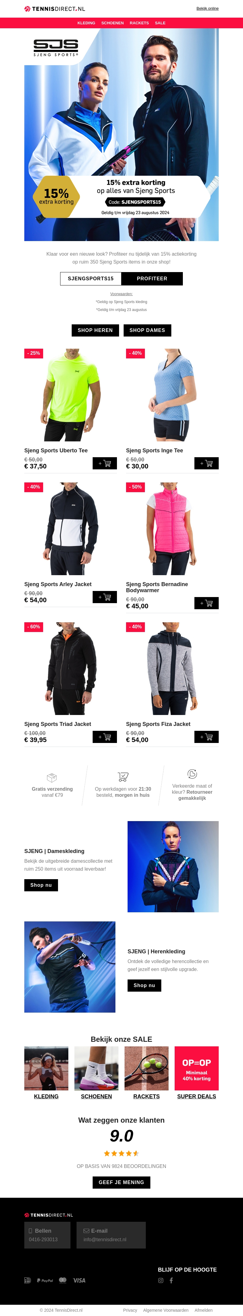 Profiteer nu van 15% extra korting op ruim 350 Sjeng Sports artikelen bij TennisDirect.nl. Gebruik de code SJENGSPORTS15 bij het afrekenen. Actie geldig t/m 23 augustus 2024. Gratis verzending vanaf €75 en morgen in huis als je voor 21:30 bestelt!