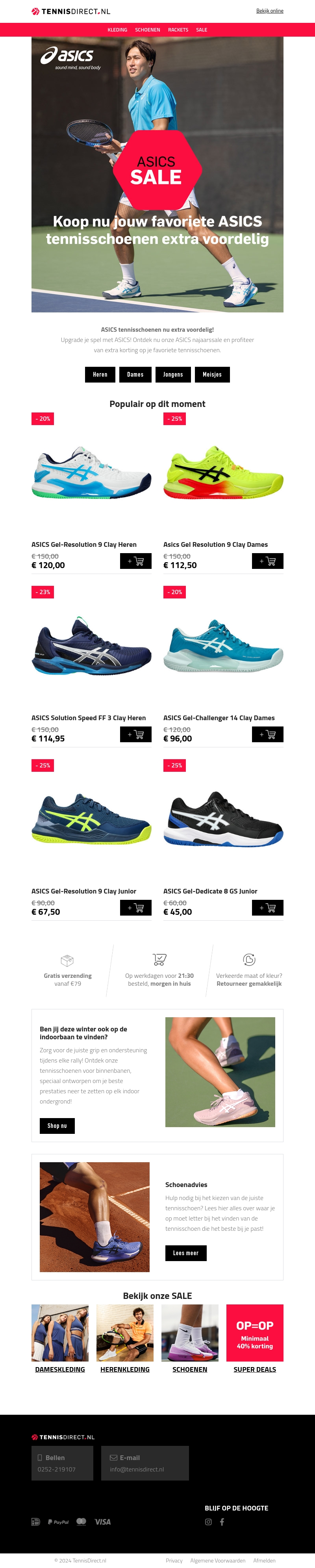 Profiteer nu van geweldige kortingen in de ASICS Sale bij TennisDirect. Kies je favoriete tennisschoenen en geniet van extra voordelige prijzen. Het assortiment omvat de nieuwste modellen voor heren, dames, en junioren. Bestel nu en ontvang gratis verzending vanaf €79. Wees er snel bij, want OP=OP!