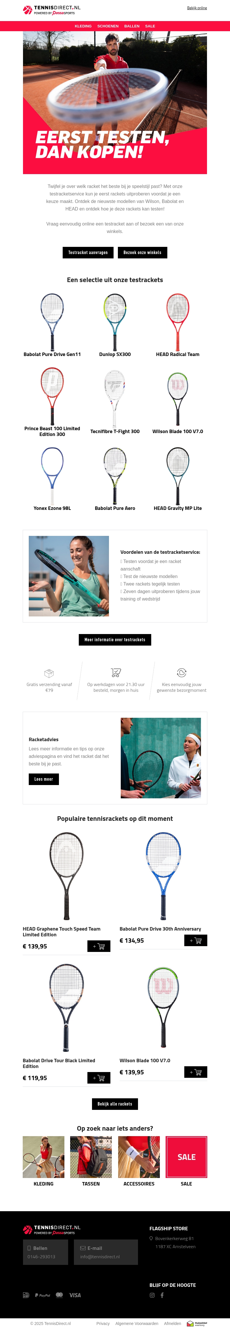 TennisDirect biedt een unieke kans om testrackets uit te proberen, zodat je zeker weet dat je racket perfect bij je speelstijl past. Kies uit topmerken zoals Wilson, Babolat en HEAD. Ontdek de nieuwste modellen en profiteer van deskundig advies. Vraag eenvoudig een testracket aan en ervaar het zelf op de baan. Perfect voor zowel training als wedstrijden.