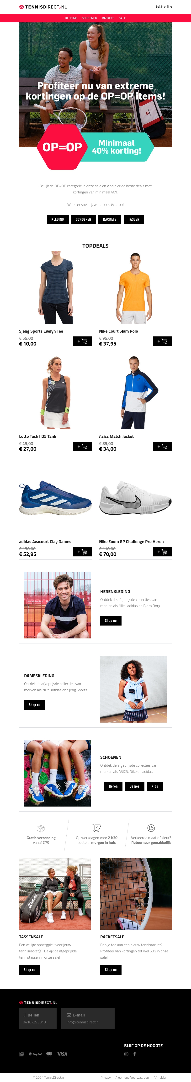 Profiteer nu van extreme kortingen op OP=OP deals bij TennisDirect! Ontvang minimaal 40% korting op kleding, schoenen, rackets, en tassen van topmerken. Mis deze unieke kans niet en shop je favorieten voordat ze weg zijn. Gratis verzending vanaf €79. Vandaag besteld, morgen in huis!