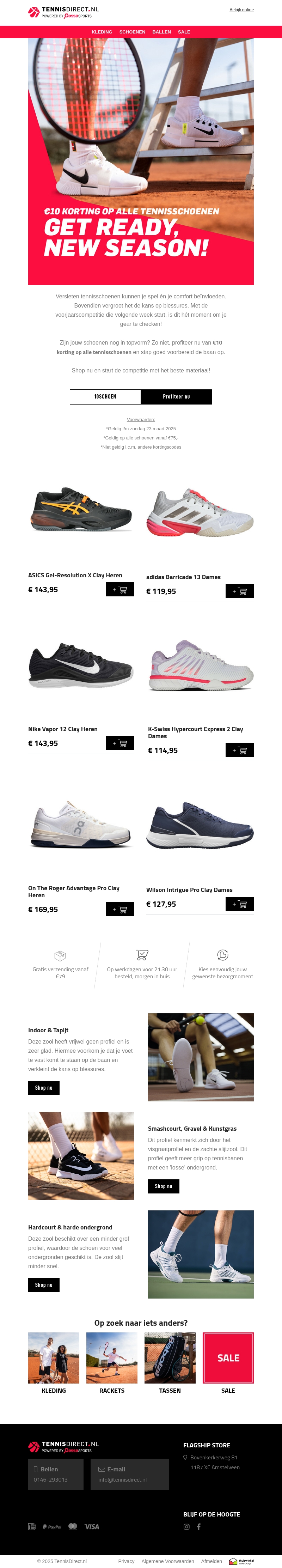 Vervang je oude tennisschoenen voor de nieuwe collectie met €10 korting. Of je nu binnen of buiten speelt, we hebben de perfecte schoenen voor elk type baan. Bestel voor 21:30 uur en krijg je bestelling morgen al thuisbezorgd. Bekijk nu ons uitgebreide aanbod van topmerken als Nike, Adidas, en meer.