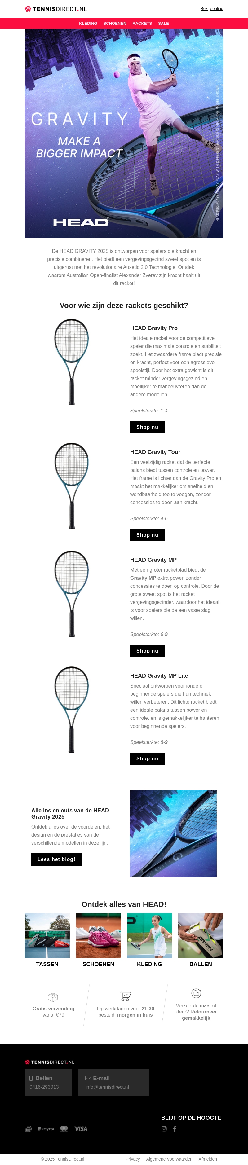 De HEAD GRAVITY 2025 serie is ontworpen voor tennissers die kracht en precisie willen combineren. Met de nieuwste Auxetic 2.0 Technologie biedt dit racket een groter sweet spot. Ideaal voor spelers zoals Australian Open-finalist Alexander Zverev, die streven naar uitstekende prestaties op de baan. Geschikte modellen variëren van de Gravity Pro tot de MP Lite, elk met unieke voordelen. Ontdek de volledige collectie en kies het racket dat bij jouw speelstijl past.