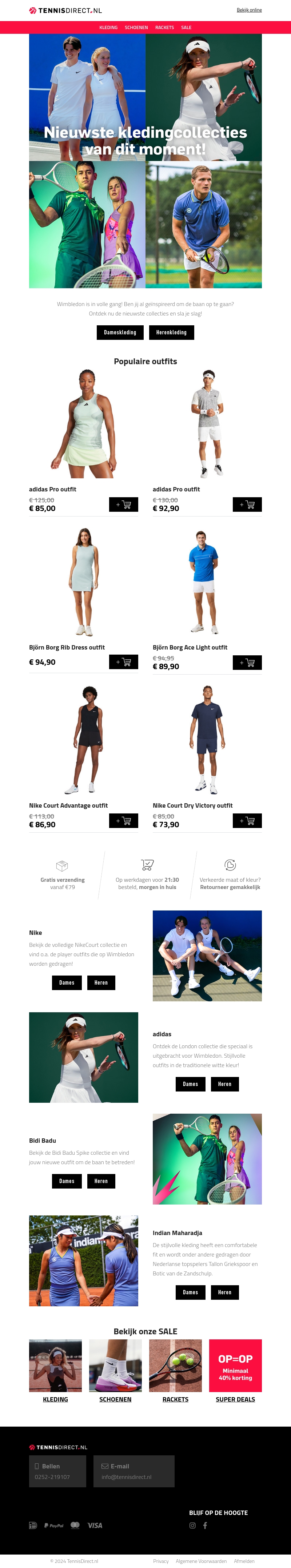Wimbledon is in volle gang! Laat je inspireren door de nieuwste tennisoutfits van merken zoals Nike, adidas en Björn Borg. Ontdek de korting en sla je slag met gratis verzending vanaf €79. Kleed je in stijl zowel op als naast de baan.