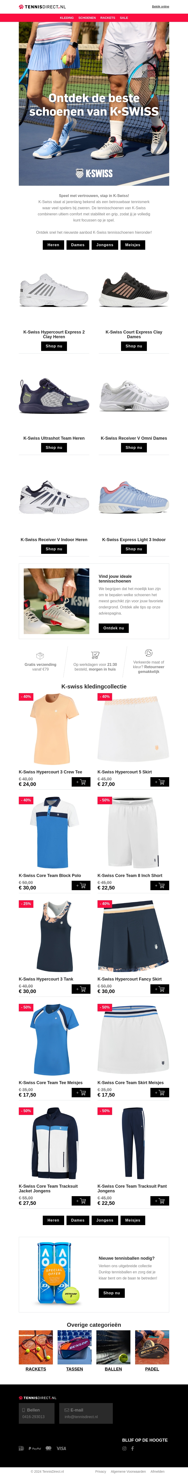 Ontdek waarom K-Swiss de keuze is voor vele sporters. Van hoogwaardige tennisschoenen tot modieuze sportkleding, er is voor ieder wat wils. Geniet van aanbiedingen en vind jouw perfecte outfit. Shop nu bij TennisDirect voor de beste deals.