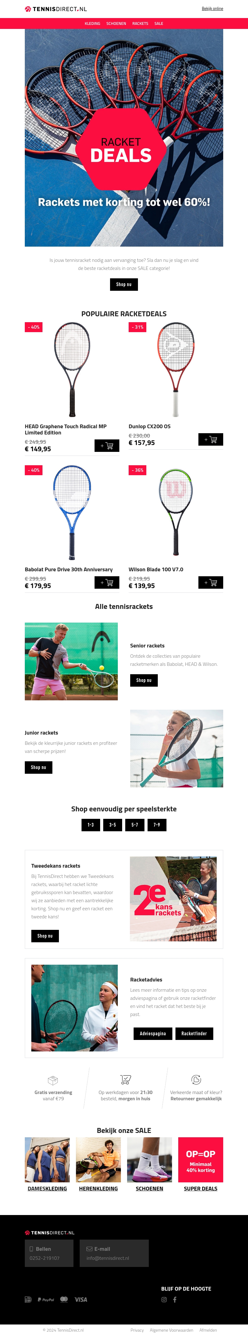 Profiteer nu van geweldige kortingen op populaire tennisrackets. Merken zoals Babolat, Wilson en Dunlop hebben scherpe aanbiedingen tot wel 60% korting. Vind jouw perfecte racket, of je nu een junior speler bent of een ervaren prof. Met gratis verzending vanaf €50 en eenvoudig retourneren, is het nooit eenvoudiger geweest om jouw ideale tennisuitrusting te scoren. Mis deze kans niet!