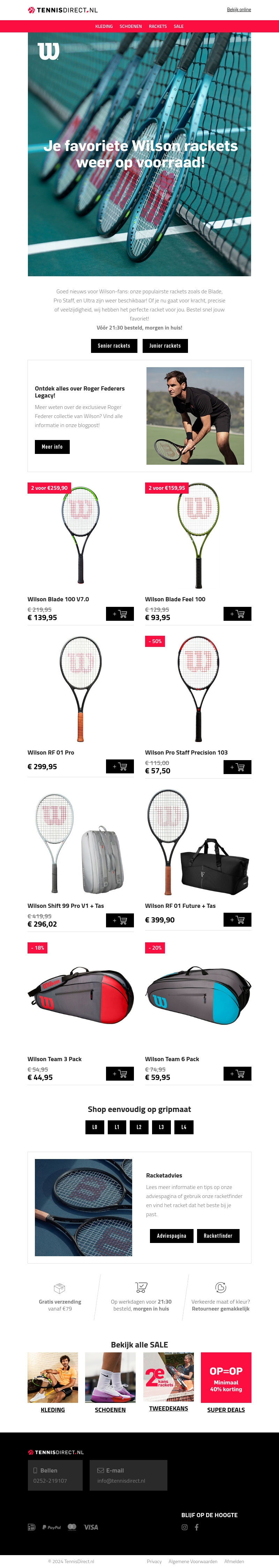 TennisDirect heeft goed nieuws voor alle Wilson-fans: je favoriete rackets zijn weer op voorraad. Of je nu kiest voor de Blade, Pro Staff, of Ultra, er is voor ieder wat wils. De nieuwste collecties zijn perfect voor elke speelstijl. Bestel vandaag nog voor 21.00 uur en ontvang ze morgen in huis. Vergeet niet de bijpassende tassen en accessoires te bekijken.