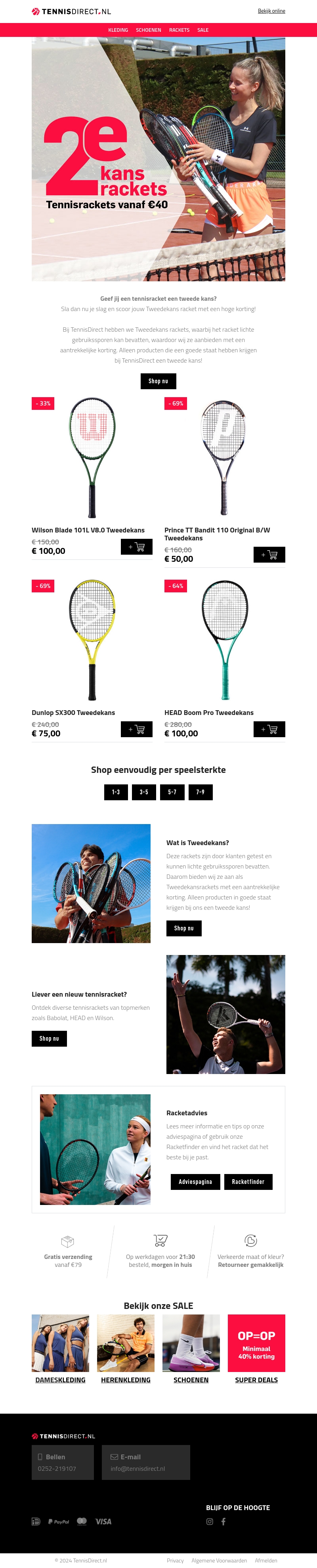 Geef een tweede kans aan tennisrackets met onze Tweedekans deals! Start je zoektocht naar voordelige rackets vanaf slechts €40. Onze selectie bestaat uit producten die kort gebruikt zijn en nog in uitstekende staat verkeren. Maak gebruik van hoge kortingen en ontdek ons assortiment van topmerken zoals Wilson en HEAD. Bestel snel je favoriete racket en profiteer van gratis verzending vanaf €75.