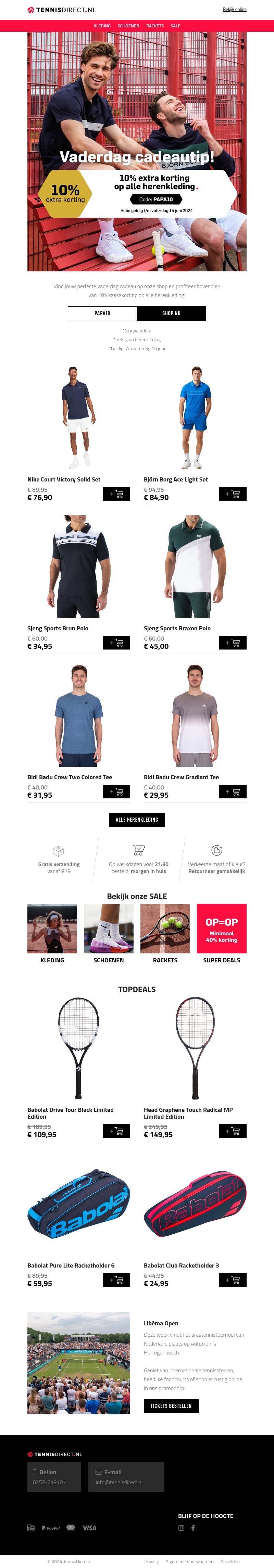 Verras je vader dit jaar met een sportieve outfit van TennisDirect. Profiteer nu van 10% kassakorting op alle herenkleding! Geldig tot en met zaterdag 15 juni 2024. Gebruik de code PAPAI10 bij het afrekenen. Gratis verzending vanaf €79 en snelle levering binnen 24 uur.