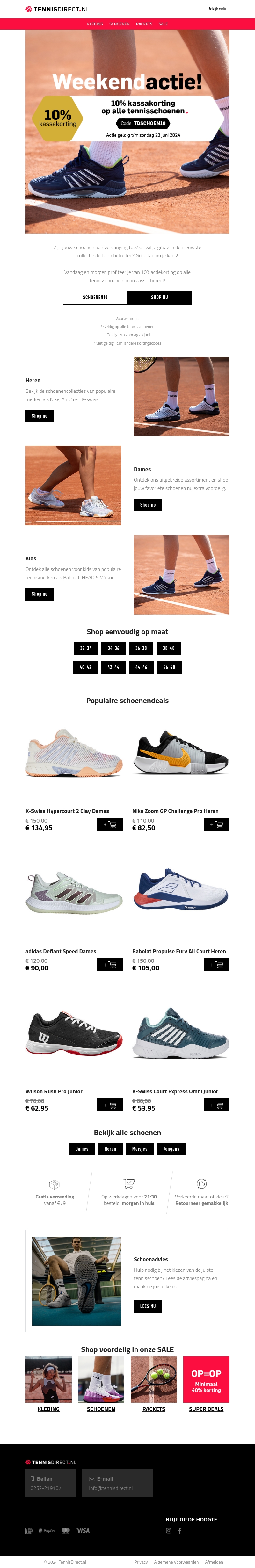 Zijn jouw schoenen aan vervanging toe? Grijp dan nu je kans! Dit weekend krijg je 10% kassakorting op alle tennisschoenen bij TennisDirect.nl. Ontdek de nieuwe collectie en shop voordelig jouw favoriete merken. Deze actie geldt tot en met zondag 23 juni 2024.