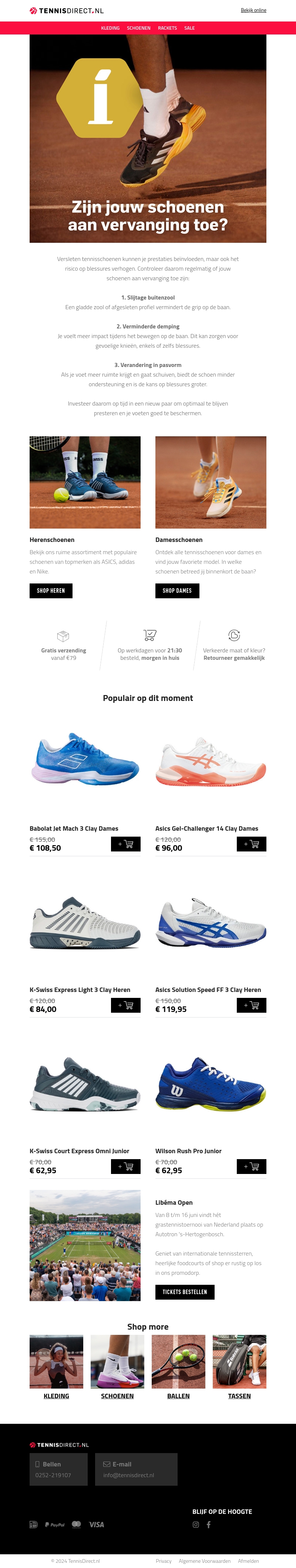 Versleten tennisschoenen kunnen je prestaties negatief beïnvloeden en het risico op blessures verhogen. Controleer je schoenen regelmatig en ontdek onze nieuwste collectie herenschoenen en damesschoenen. Profiteer van gratis verzending vanaf €79 en snelle levering.